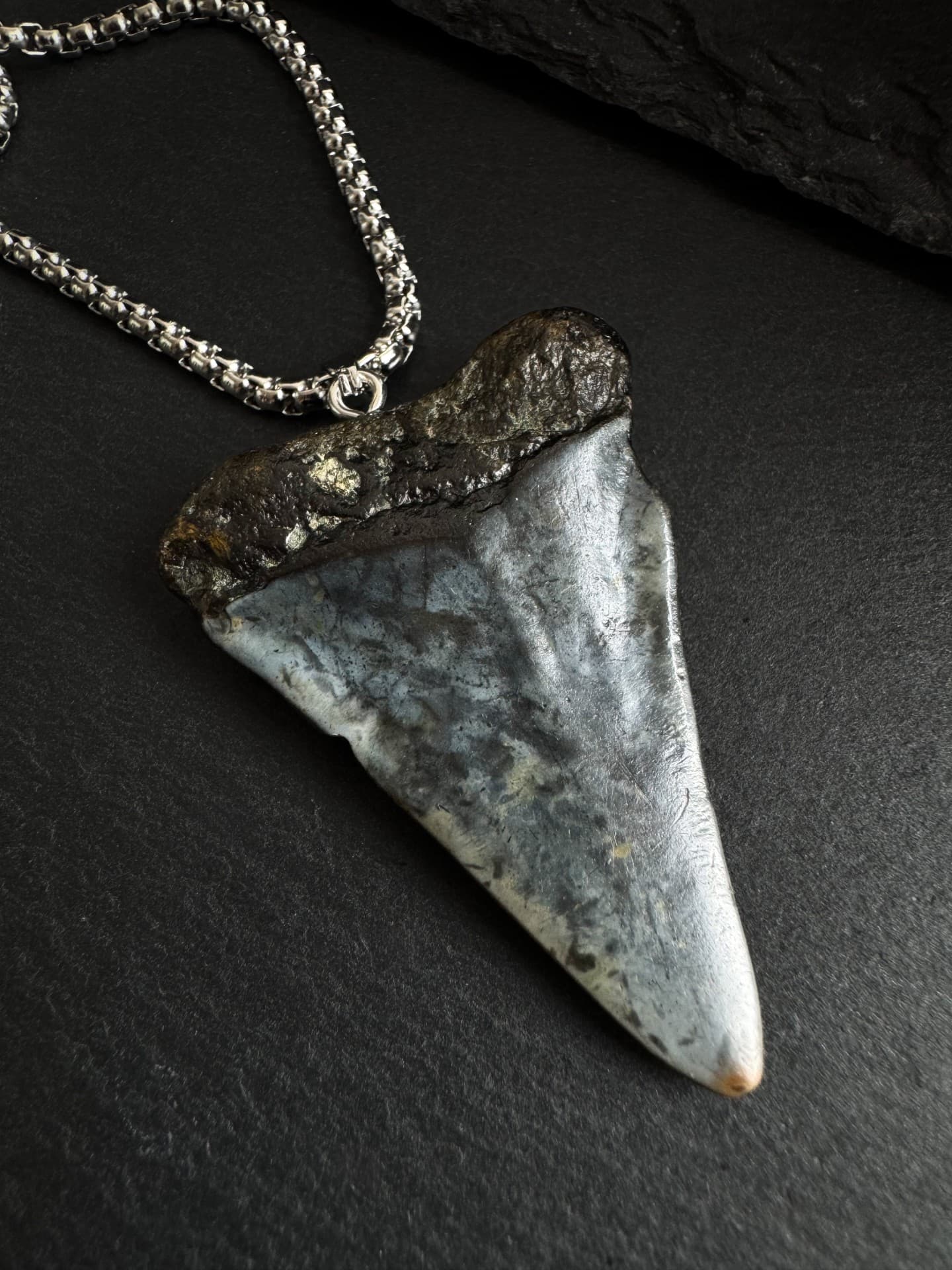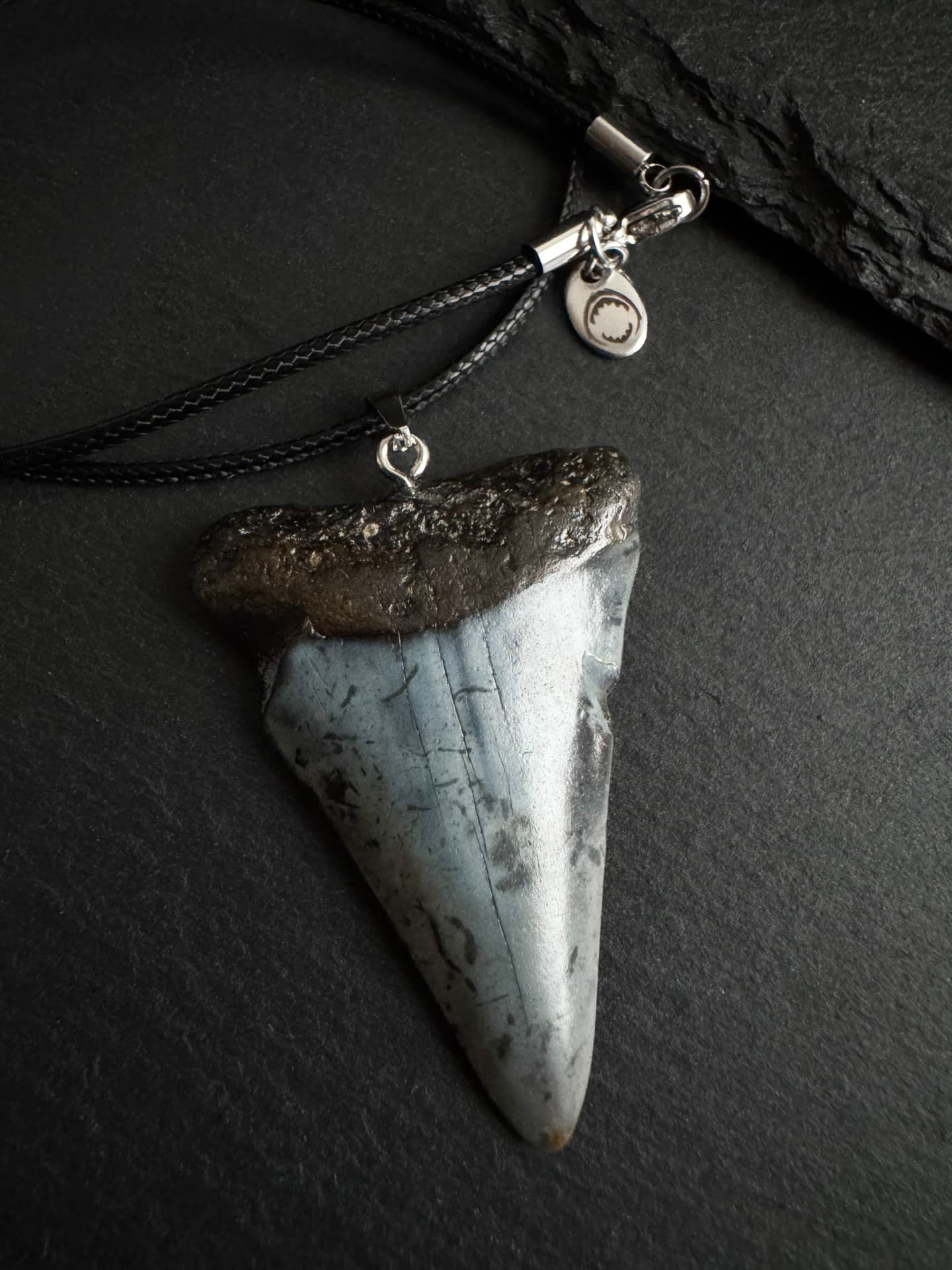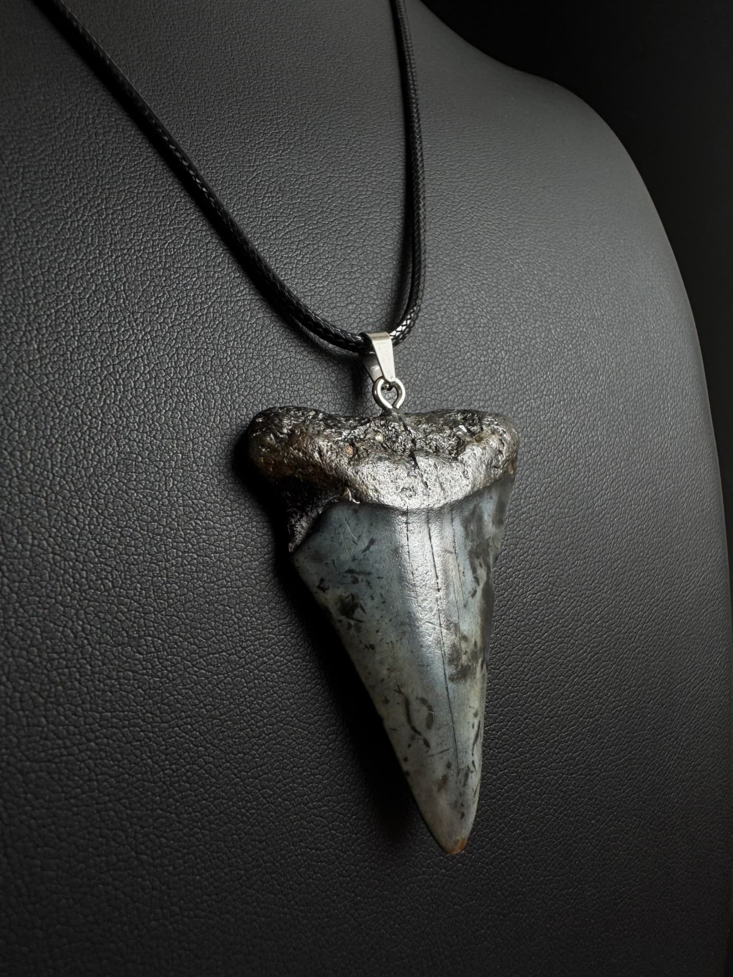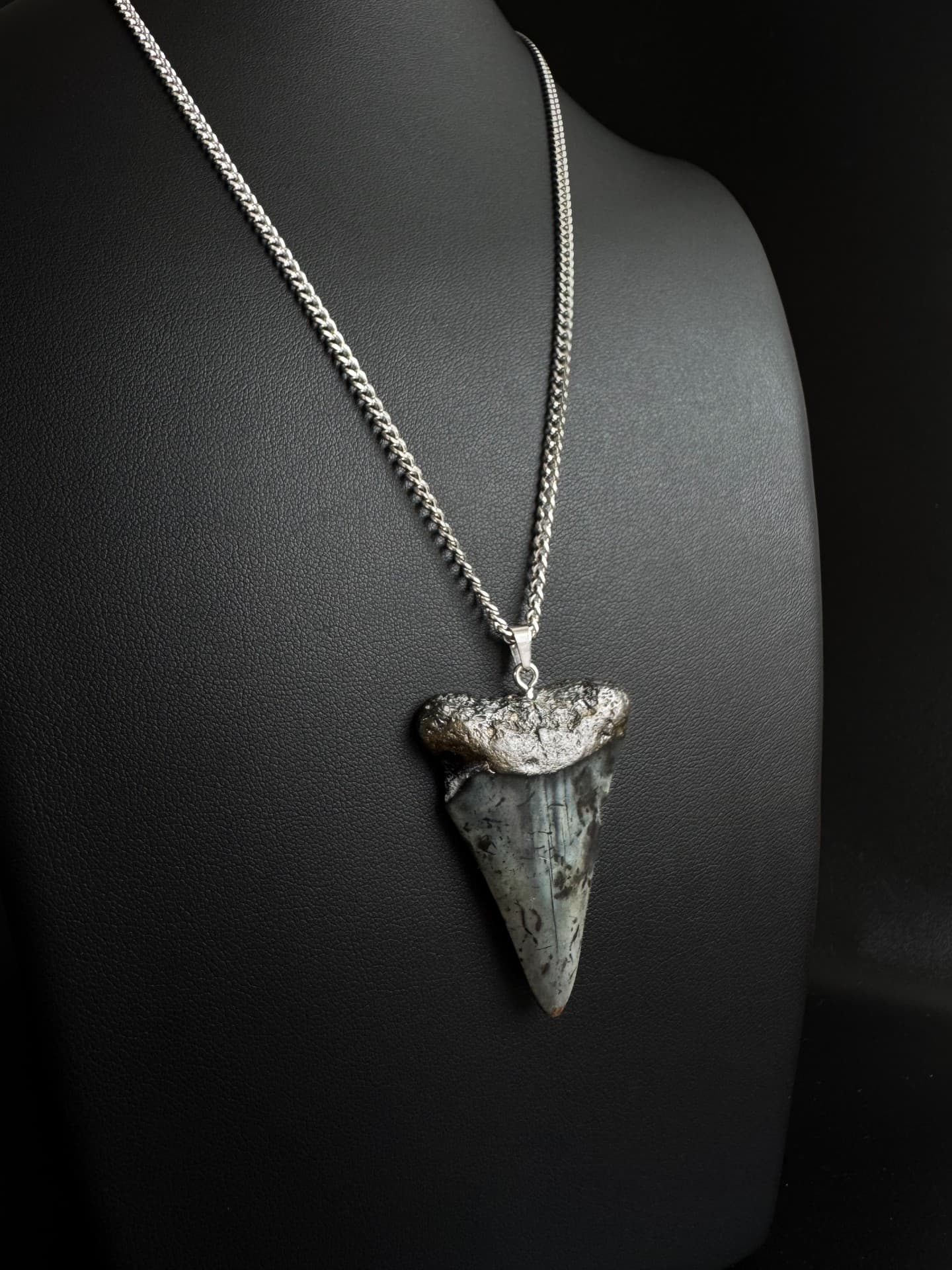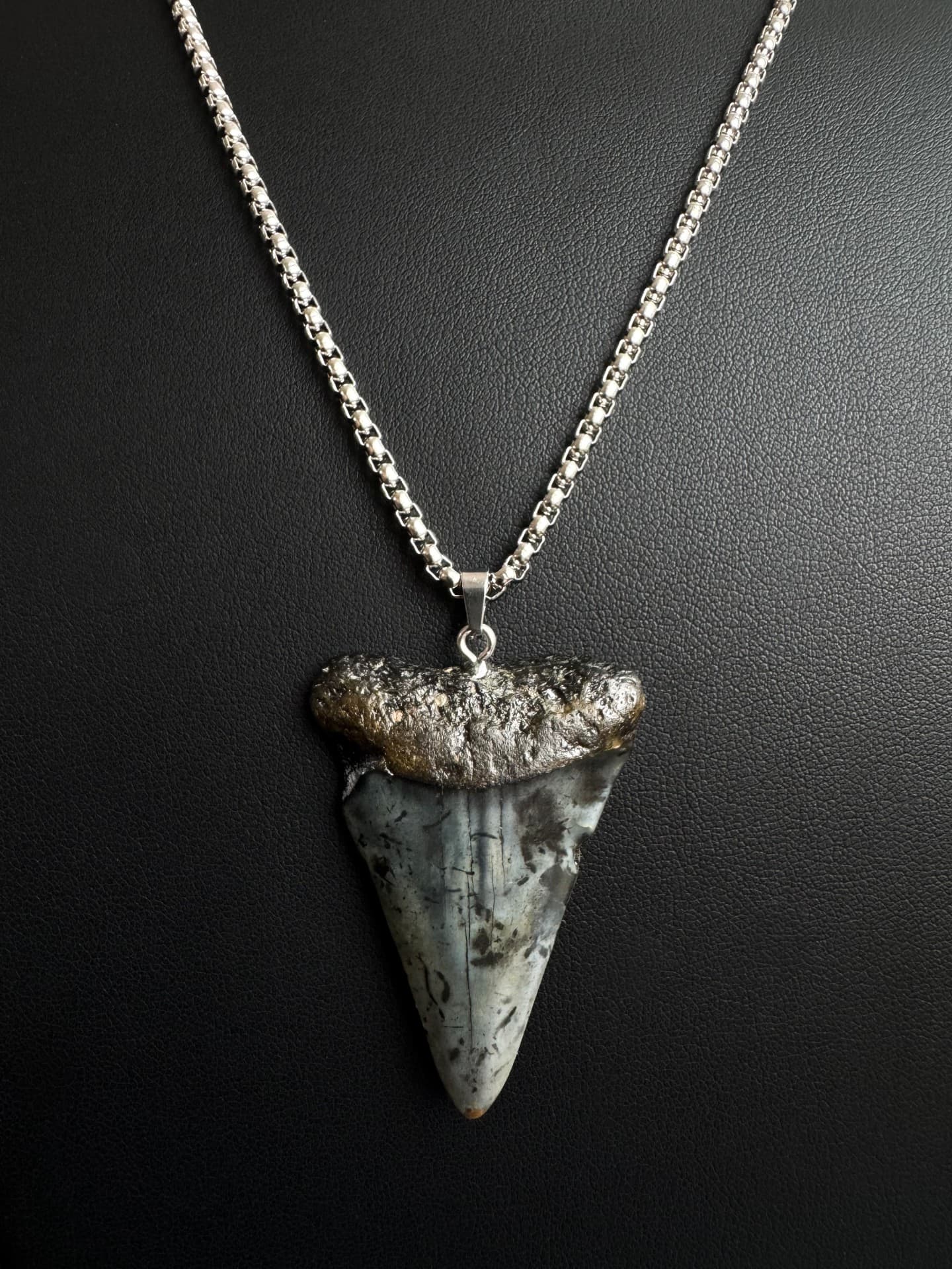 This is the exact tooth you’ll get. It’s a real fossil of an Ancestral Great White shark tooth, approximately 5-10 million years old. You can choose the necklace style and length you prefer.