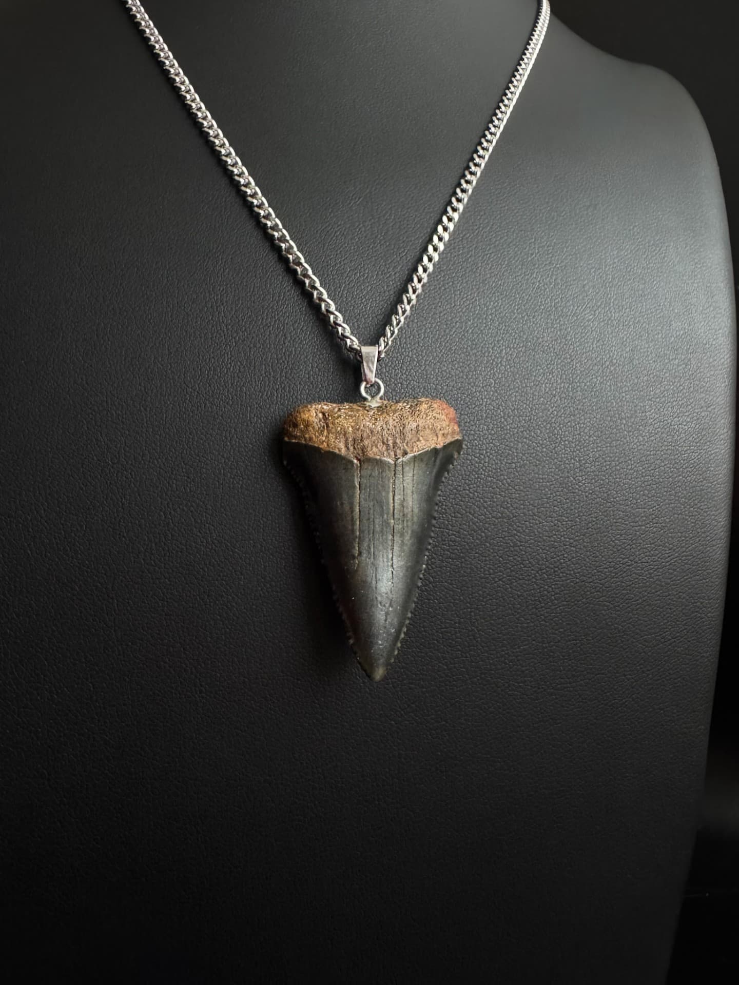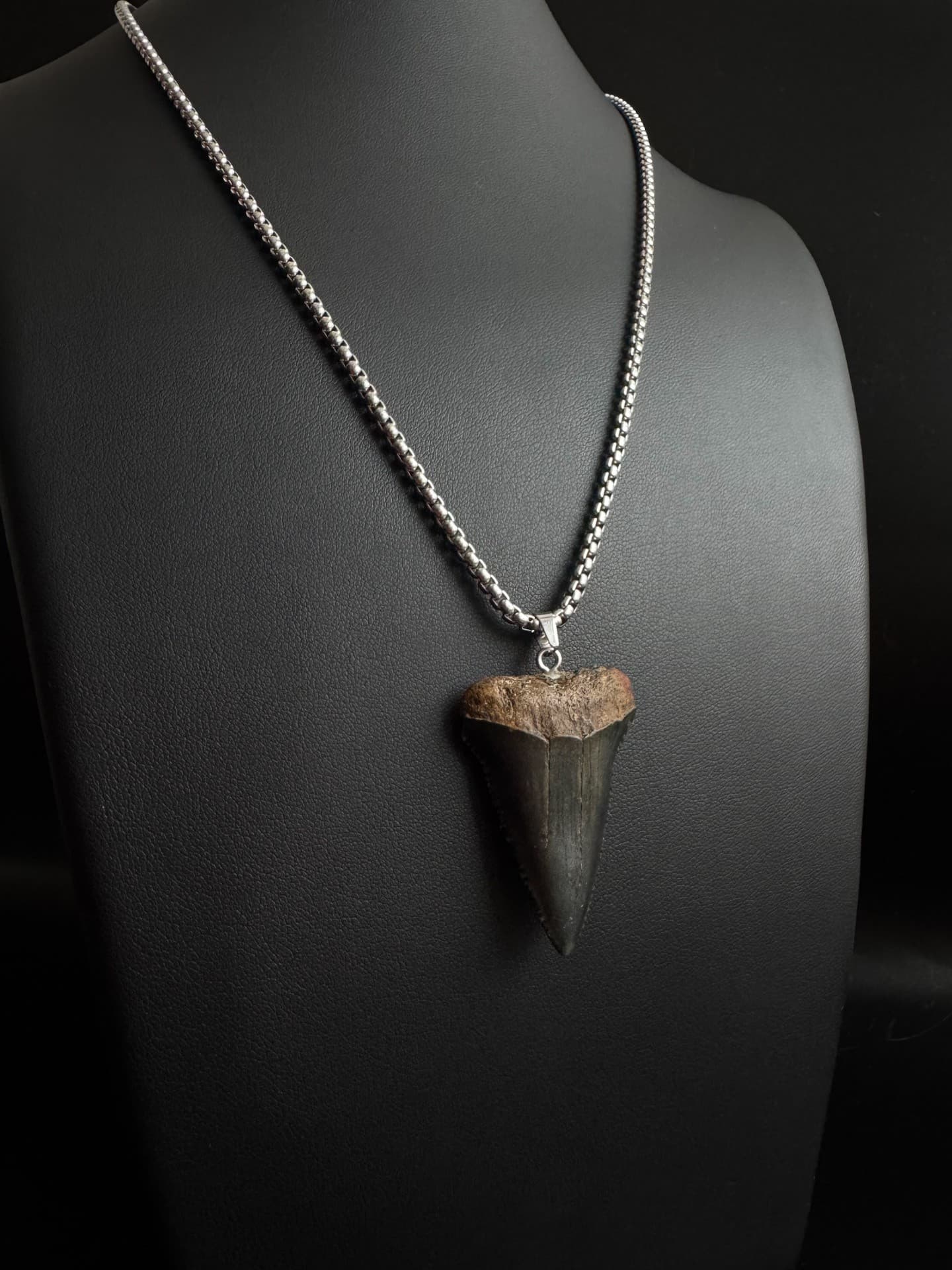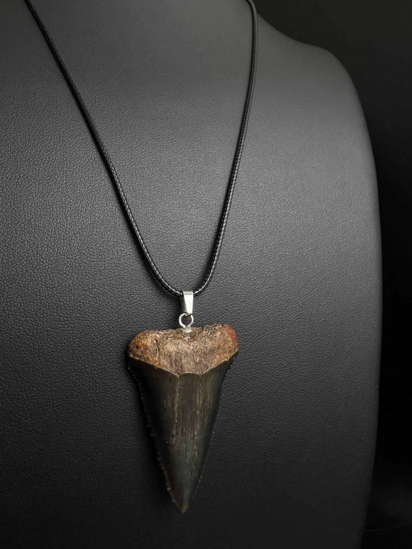 This is the exact tooth you’ll get. It’s a real fossil of an Ancestral Great White shark tooth, approximately 5-10 million years old. You can choose the necklace style and length you prefer.
