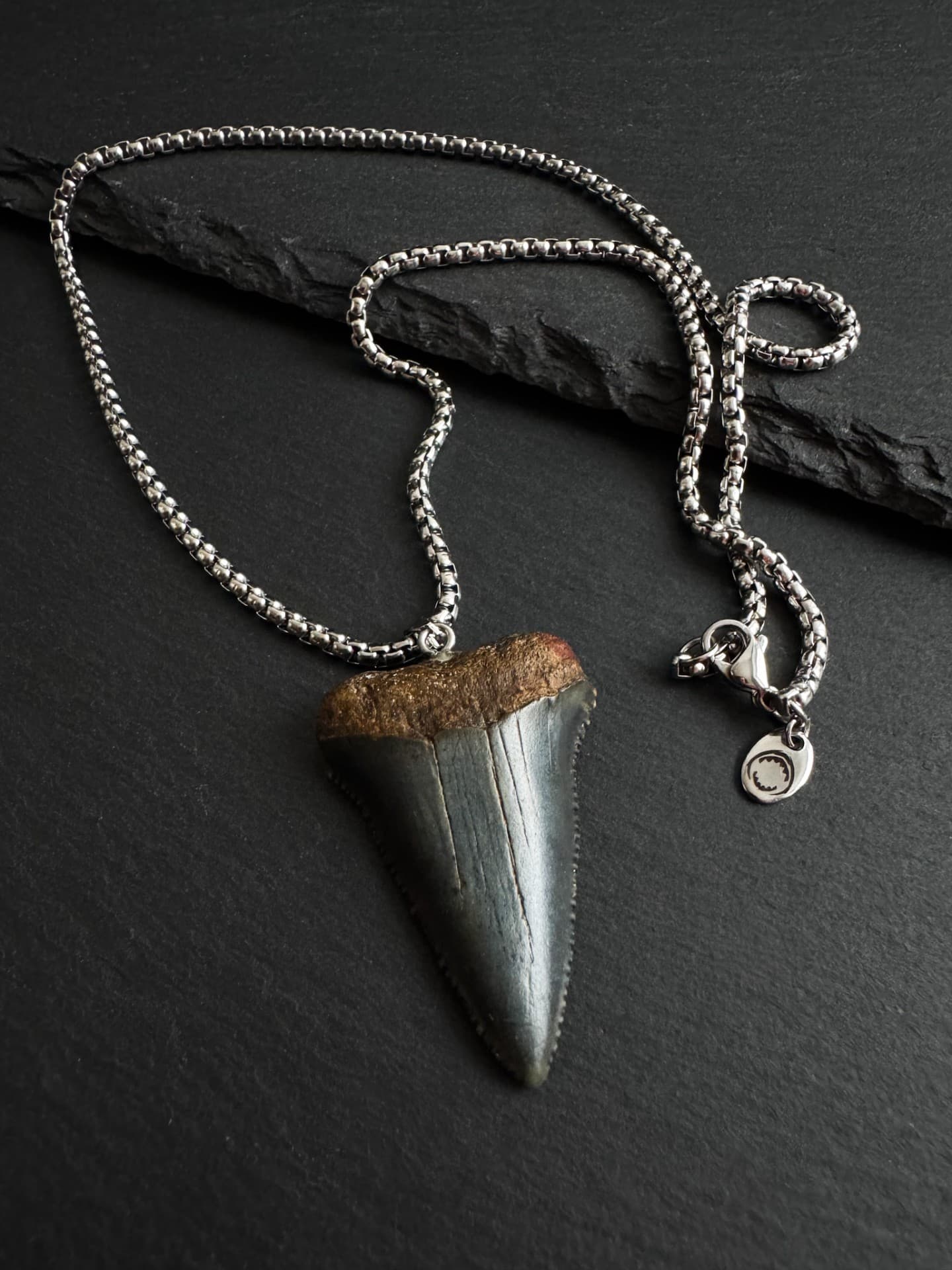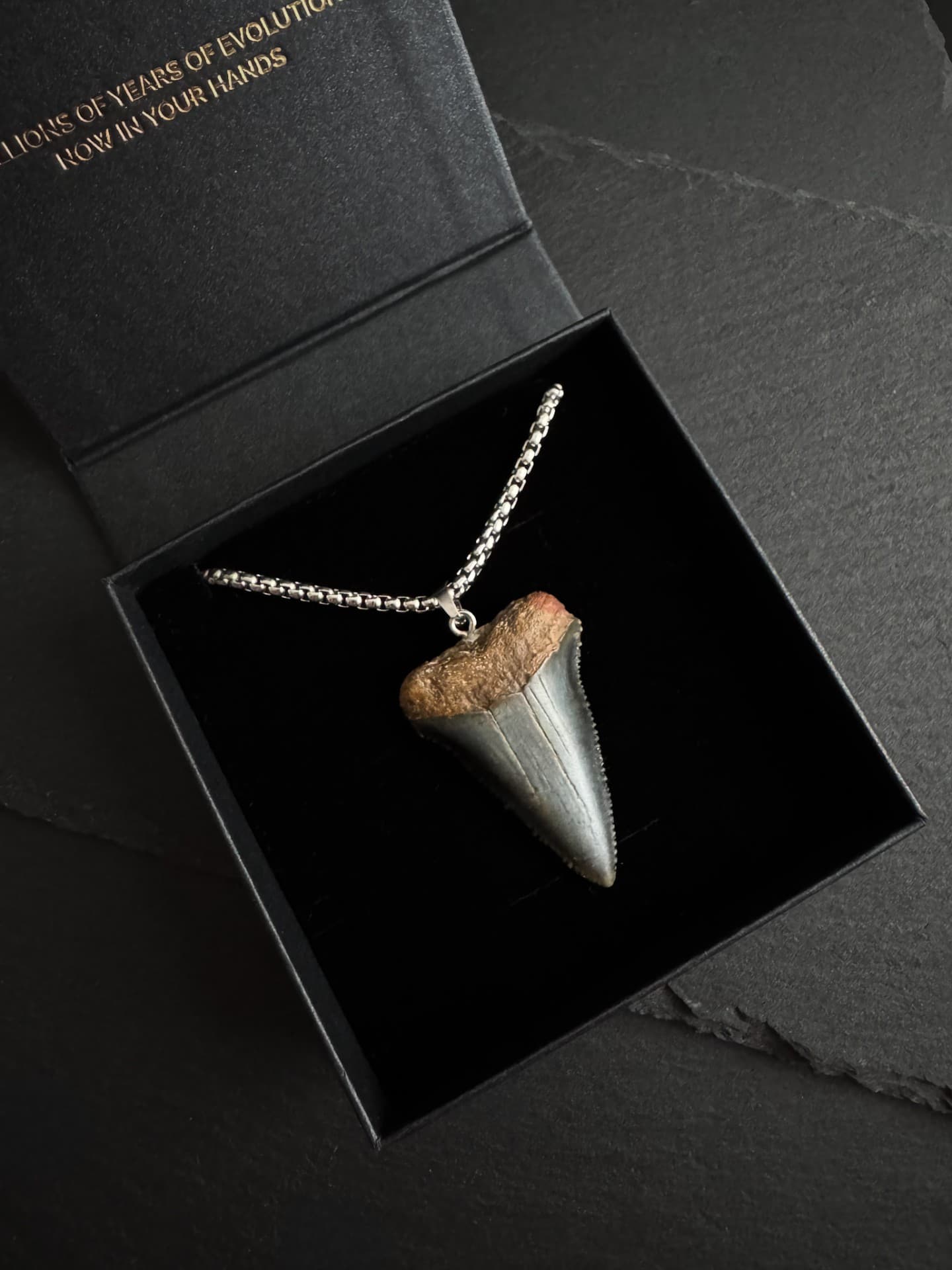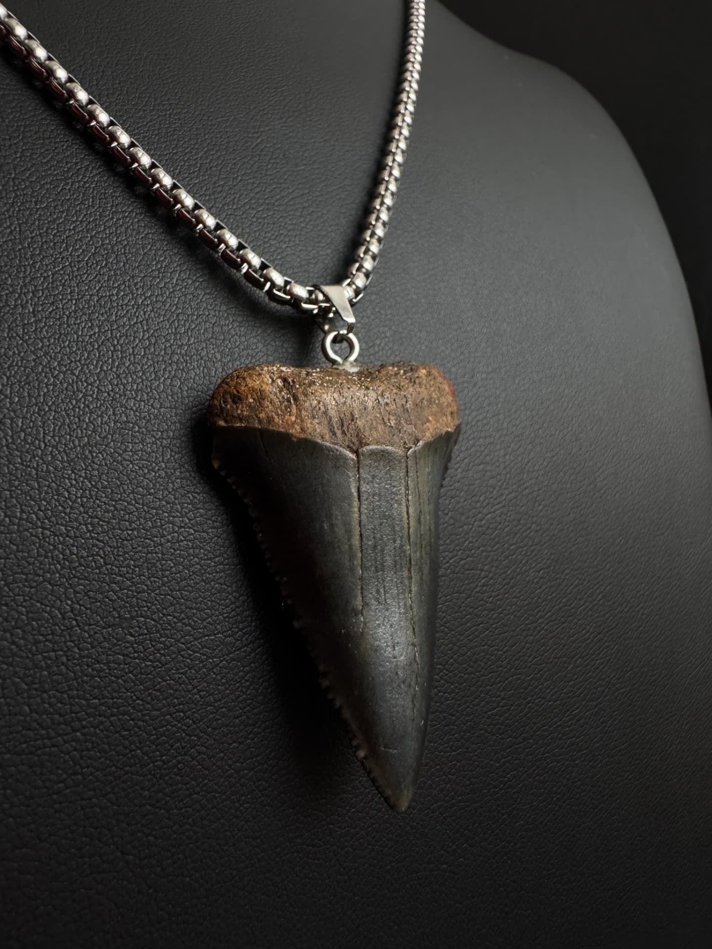 This is the exact tooth you’ll get. It’s a real fossil of an Ancestral Great White shark tooth, approximately 5-10 million years old. You can choose the necklace style and length you prefer.